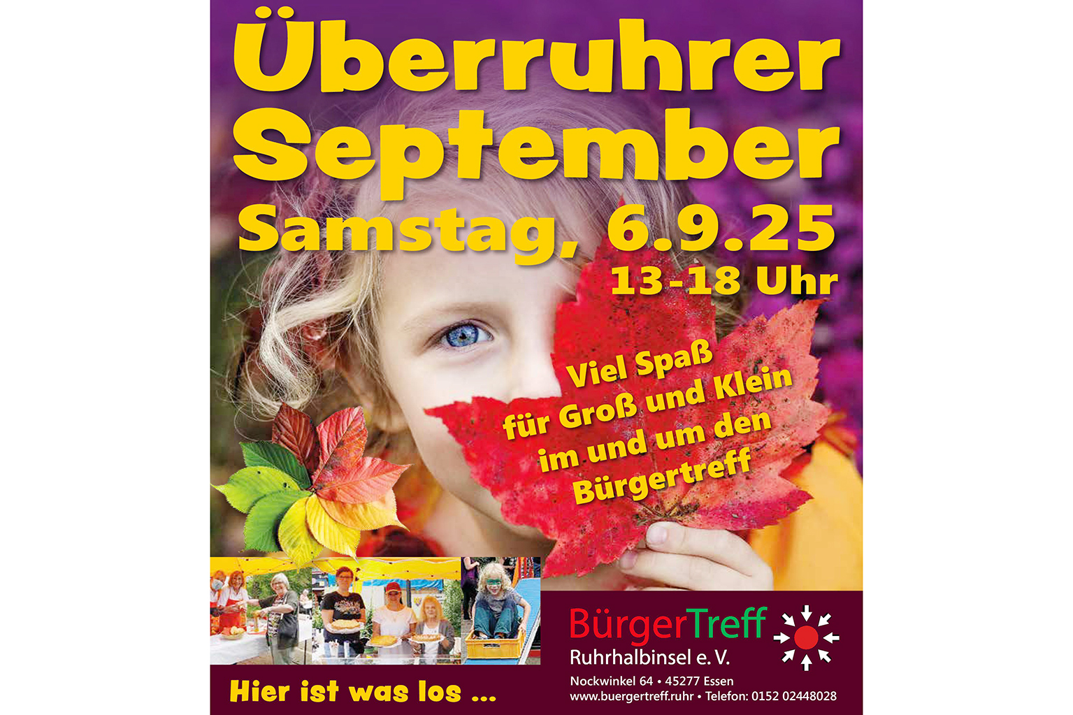 Das BürgerTreff Ruhrhalbinsel-Tea lädt zum „Überruhrer September“, am Samstag, 6. September, von 13 bis 18 Uhr am Nockwinkel 64 ein. Bereits zum fünften Mal bietet dieses Fest ein buntes und abwechslungsreiches Programm für die ganze Familie.