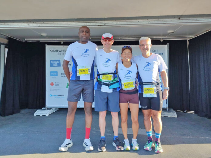 Das Laufteam des TC Kray 1892 startete beim Stadtwerke Bochum-Halbmarathon. Das Ouartett wuchs über sich hinaus und kam nach 1:43:02 Std. ins Ziel, Platz 4 bei den Mixed Staffeln übertraf alle Erwartungen. Foto: TCK