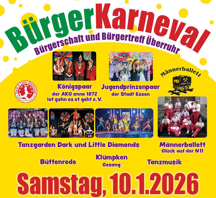 Die Überruhrer Bürgerschaft und der BürgerTreff Ruhrhalbinsel laden am Samstag , 10. Januar, zum vierten Bürgerkarneval in den BürgerTreff am Nockwinkel 64 ein. Die Veranstaltung bietet ein „jeckes“ Programm mit Tanz, Musik, klassischer Büttenrede u.v.m. Die Dark Diamonds und Little Diamonds der AKG anno 1872 sorgen für Schwung und Unterhaltung auf der Bühne. Dazu gibt es eine humorvolle Büttenrede sowie bekannte Karnevalslieder zum Mitsingen. Als besonderes Highlight tritt das Männerballett „Glück auf“ der Närrischen 11 auf. Einlass: 15, Start: 16 Uhr, Karten (fünf Euro) gibt’s im Vorverkauf bei Bücher Schirrmeister, Nockwinkel 101. Und klar: Für Kaffee & Kuchen ist gesorgt.