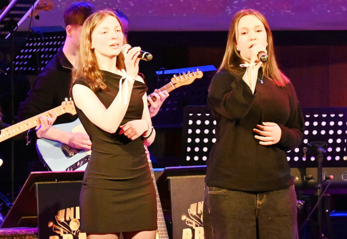 Die United Brass Big Band bringt nicht nur tolle Musiker auf die Bühne, es zeigt sich, dass die Schule auch auf stimmgewaltige Sänger zurückgreifen kann: Erste Gänsehautmomente erzeugen Amelia und Victoria mit „Wake Me Up When September Ends“.