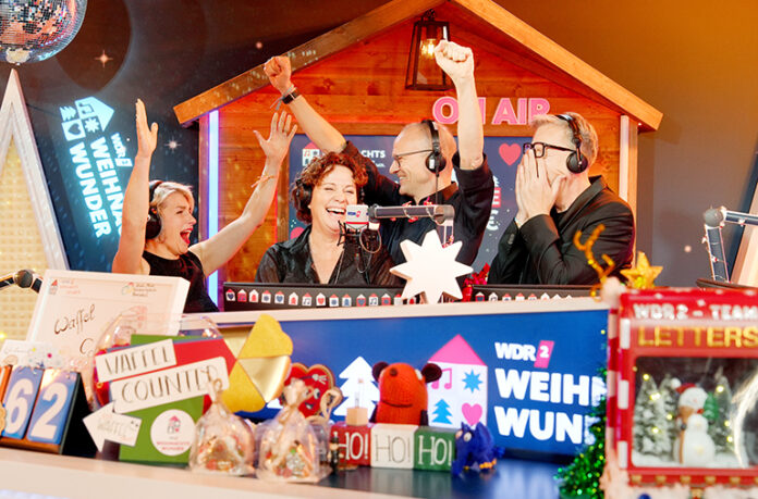 Bekannte Musik-Acts, kreative Spendenaktionen und gut hundert Stunden Live-Programm aus einem gläsernen Sendestudio: Der Essener Burgplatz wurde vom 13. bis 17. Dezember zur Live-Bühne. Unter dem Motto „Gemeinsam gegen den Hunger in der Welt“ rief das Bündnis „Aktion Deutschland Hilft“ bereits zum vierten Mal mit dem WDR zu Spenden auf. Die bekannten WDR 2 Moderatoren Sabine Heinrich, Steffi Neu, Jan Malte Andresen und Thomas Bug sendeten rund um die Uhr aus dem Glashaus vom Essener Weihnachtsmarkt. Beim „WDR 2 Weihnachtswunder“ ist in diesem Jahr die Rekord-Spendensumme von 15.644.256 Euro zusammengekommen. Foto: WDR